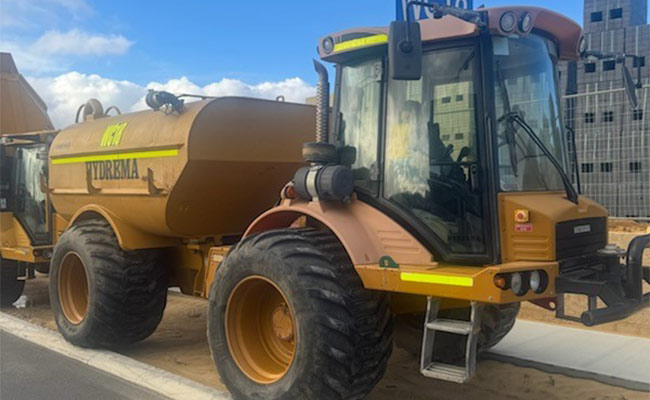 - 4×4 articulated water truck with a 2,500‑gal (9,500L) tank capacity — ideal for dust suppression, soil compaction, and water distribution on remote or dusty sites.